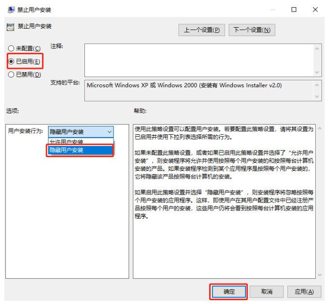 弹出窗口,如图,勾选【已启用】,点击【用户安装行为】,选择【隐藏用户安装】,最后点击【应用】——【确定】,