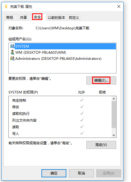打开面板,点击切换【安全】选项,然后点击【编辑】,如图,逐一选择每一个组或用户名,在完全控制里勾选拒绝