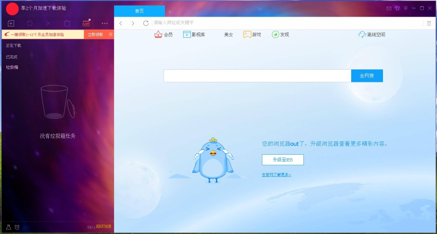 以迅雷9为例,迅雷的界面比较时尚,功能比较齐全,而且自带了搜索引擎,但是缺点是广告较多。