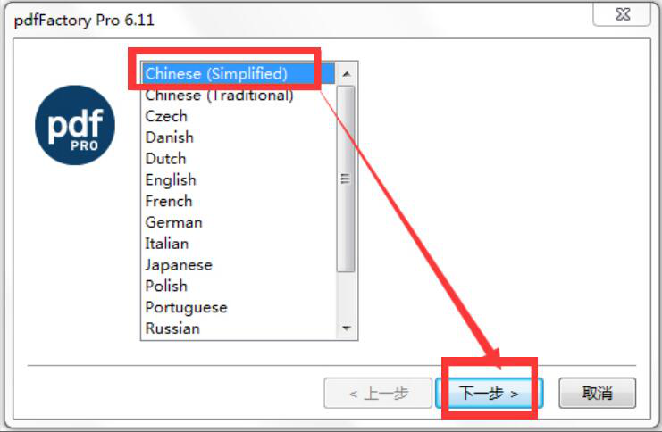 2、然后,便进入pdffactory pro的操作语言的选择窗口,这里,选择简体中文,并点解窗口右下方的“下一步”按钮,从而继续安装pdffactory pro。