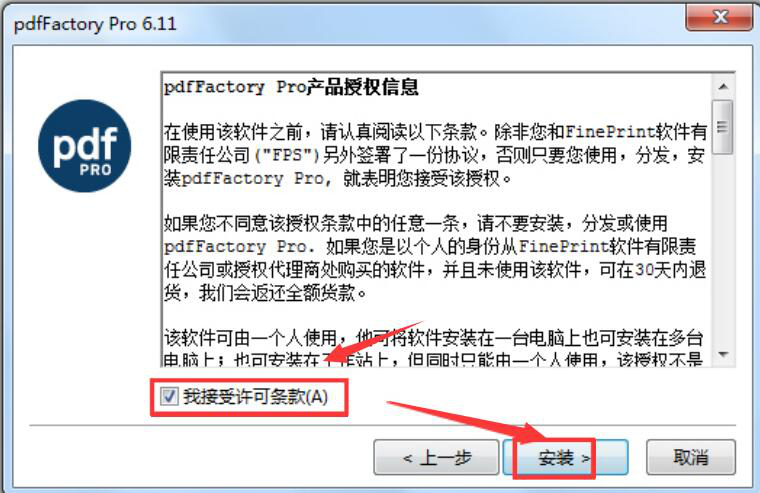 4、接下来,在pdffactory pro安装过程中,要勾选“我接受许可条款(A)”并点击“安装”的按钮。