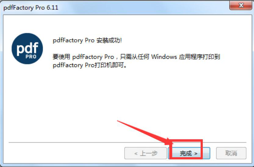 6、最后,如果pdffactory pro安装的进度完成了,它会弹出如下图的提示,用户只需点击“完成”按钮。至此,pdffactory pro安装完毕。用户以后需要打印PDF文件的时候就运行该pdffactory pro即可。