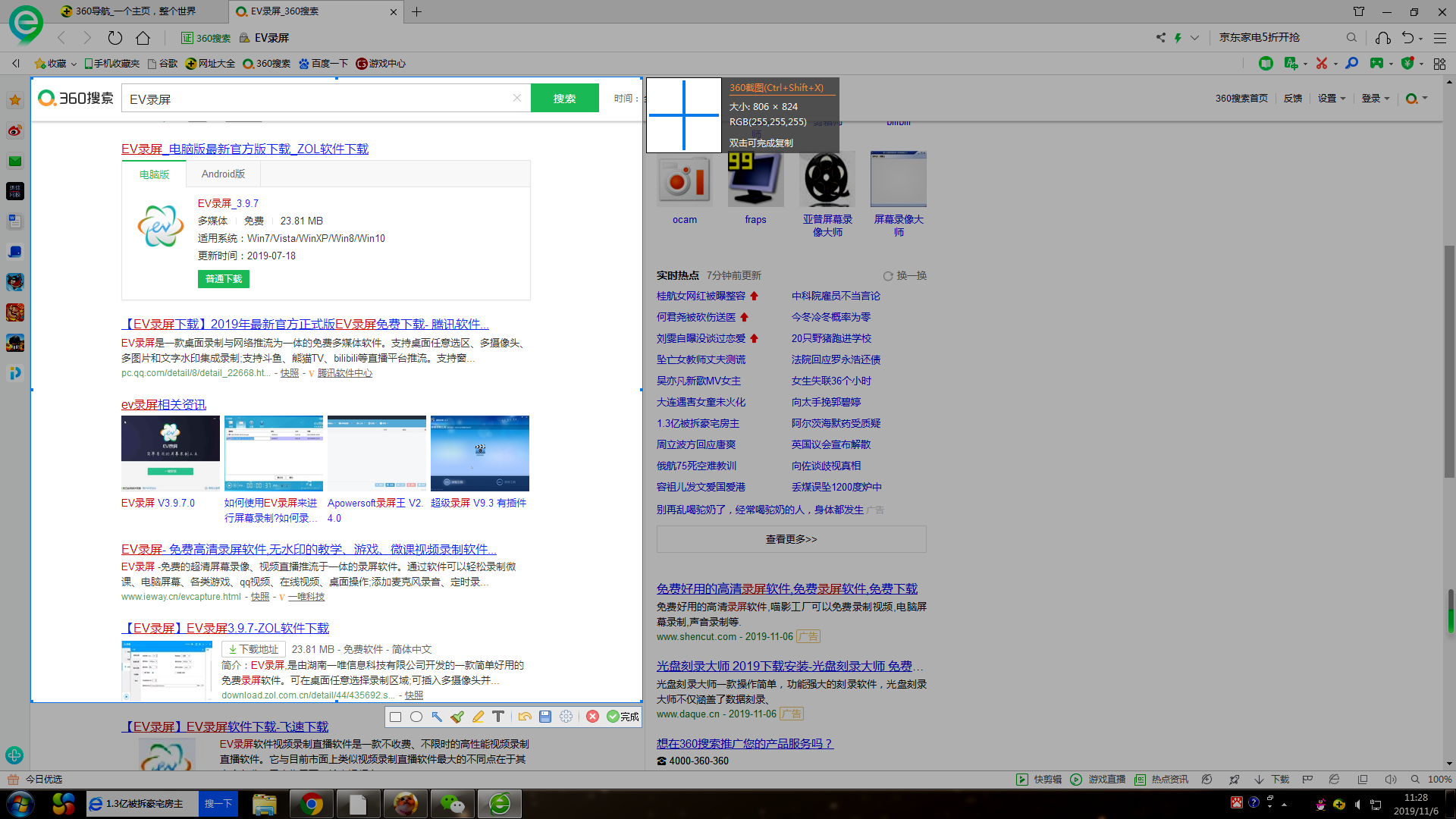 如果你的电脑中安装了360浏览器,可以利用快捷键【Ctrl+Shift+X】进行截图,框选指定区域,点击右下角的【完成】,即可将图片粘贴到Word文档或者聊天对话框。