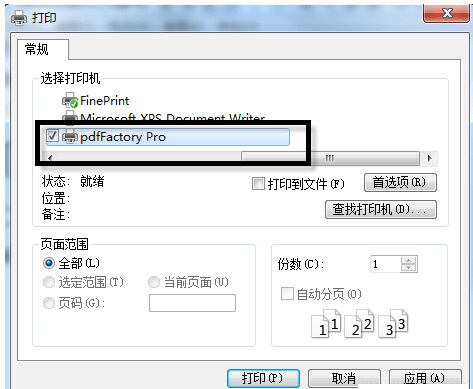 8、在弹出的打印窗口中选择pdfFactory Pro,
