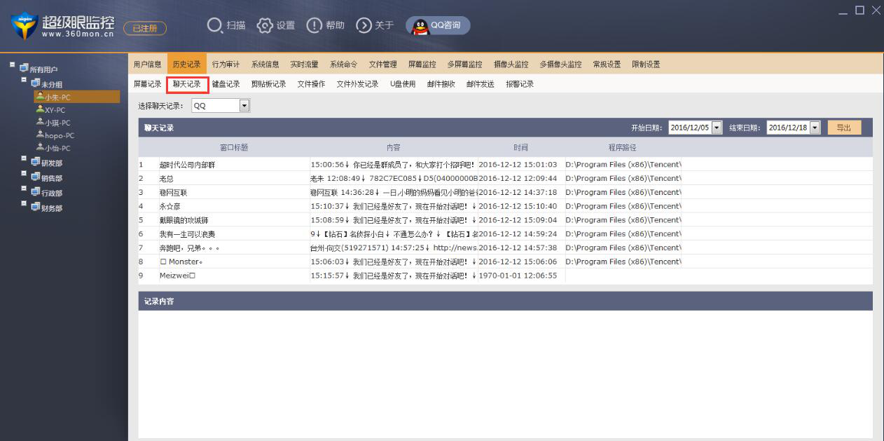 聊天记录功能。超级眼监控的这个功能常会被用到。它的管理端可以直接查看员工的聊天记录,看看员工有没有利用上班时间聊与工作无关的事情。