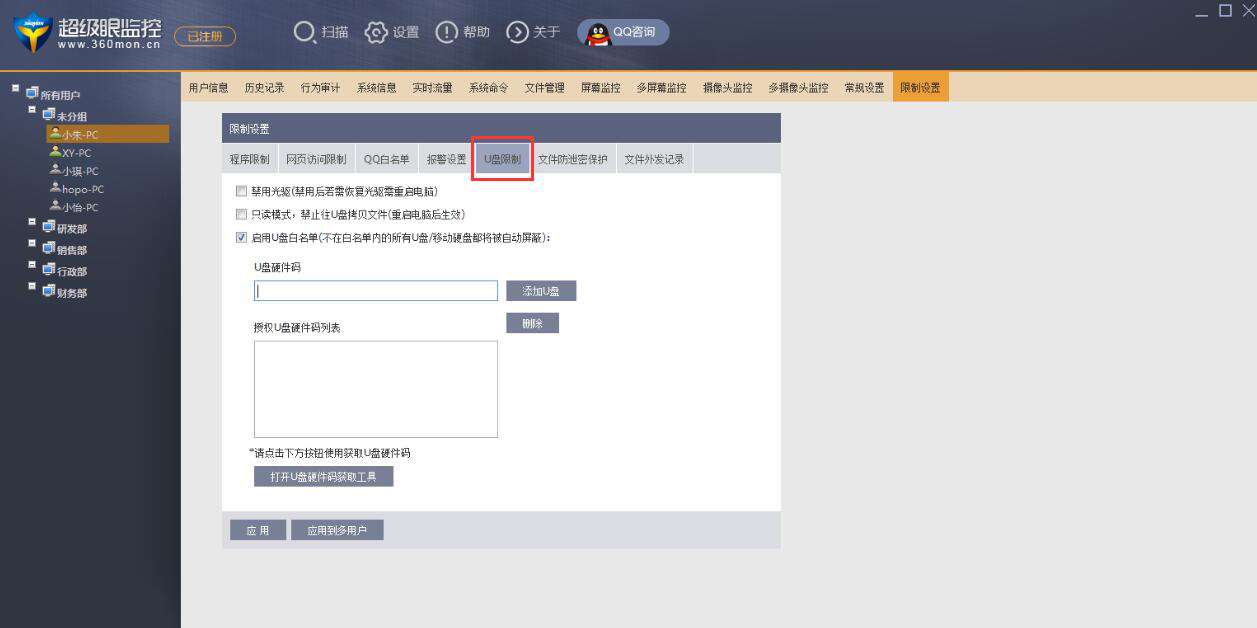 U盘限制使用。超级眼监控还有一个过人之处。就是它能限制U盘和电脑的连接。只有通过授权的U盘才能从公司电脑进行拷贝。这对于大企业来说,能有效防止公司数据被任意拷贝。