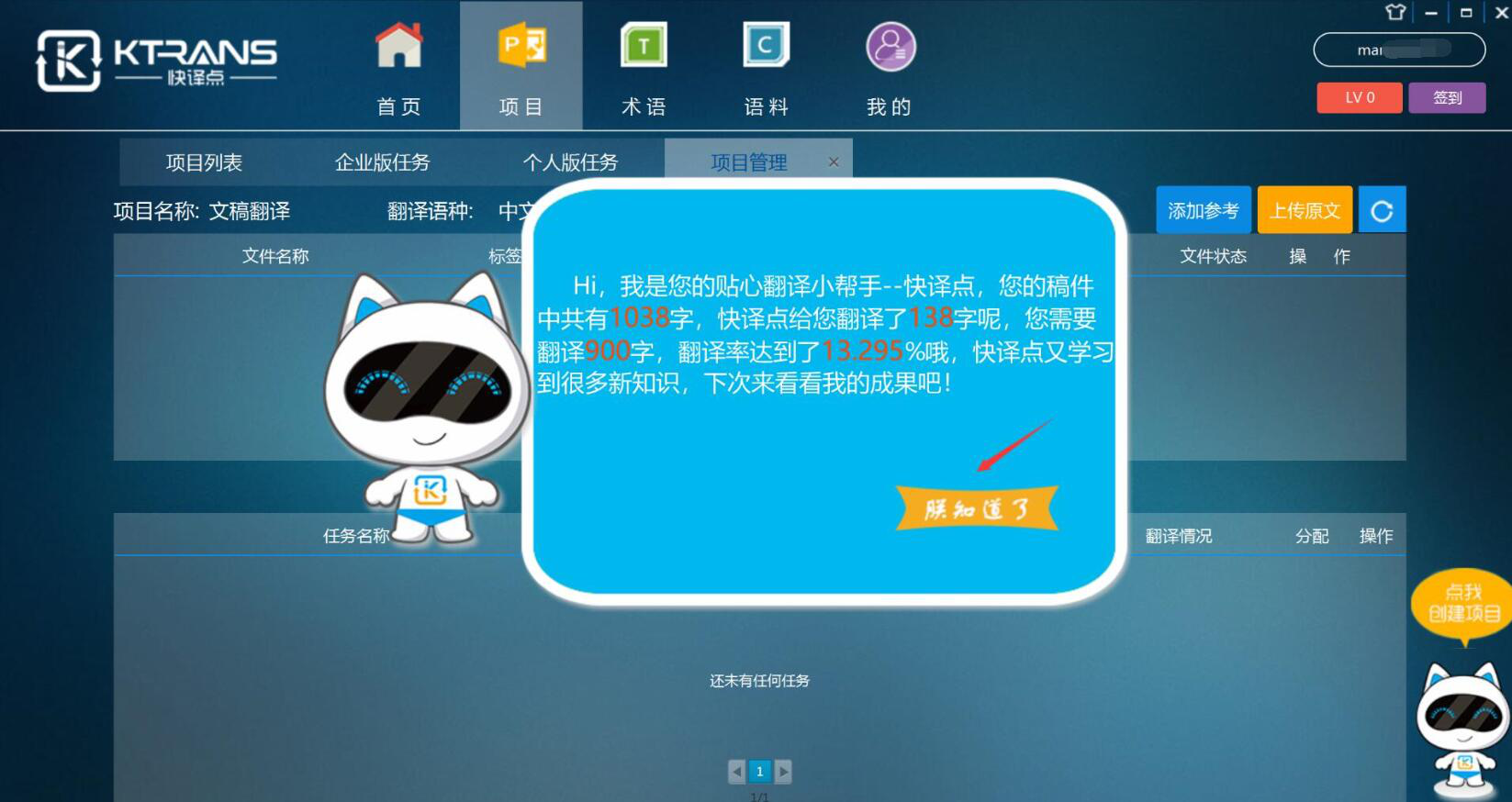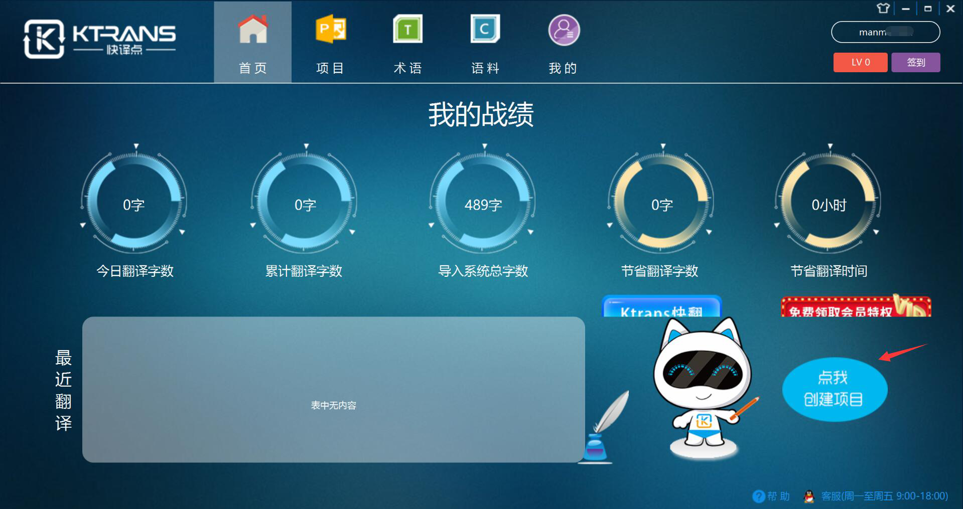 2、登录进入快译点,在快译点主界面中点击“点我创建项目”,从而进入快译点快速翻译的下一步操作。