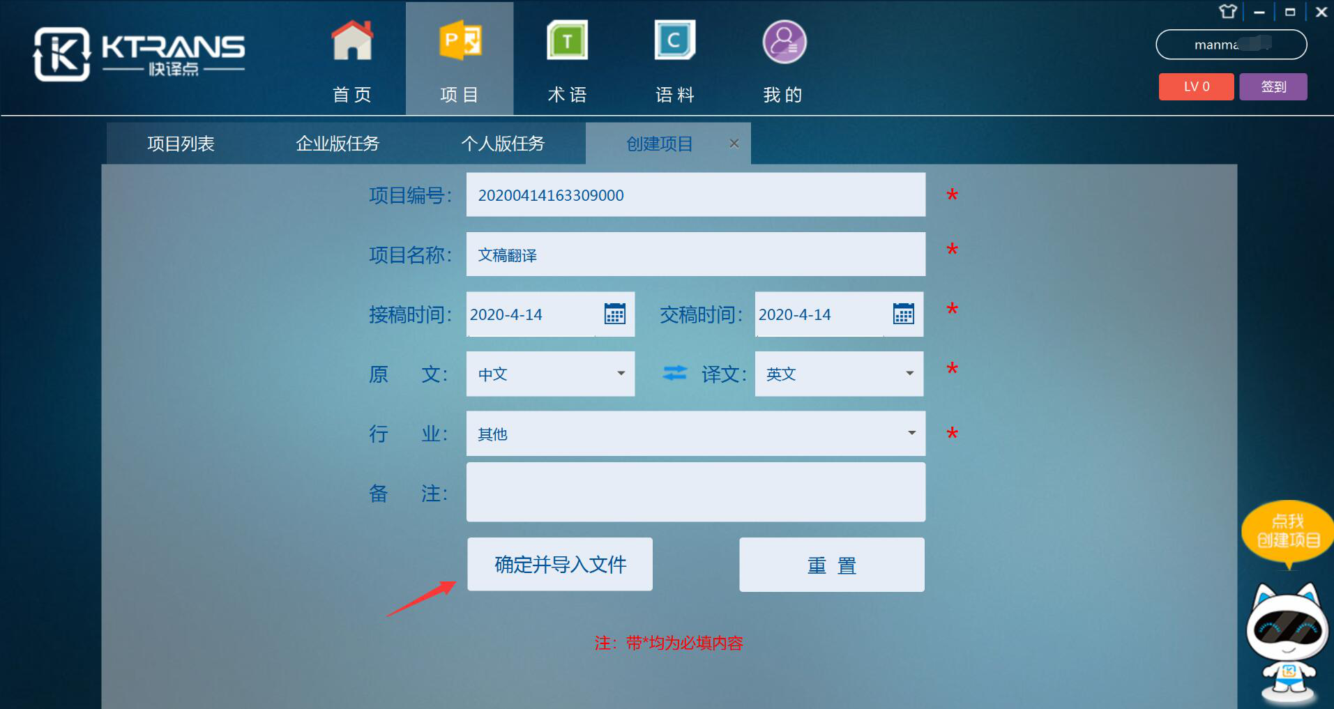 3、然后,快译点会自动进入“创建项目”的操作界面。在此界面中,标了红色星星符号的就是必填的,用户根据自己的需要进行设置,当设置完成后点击“确定并导入文件”的按钮。