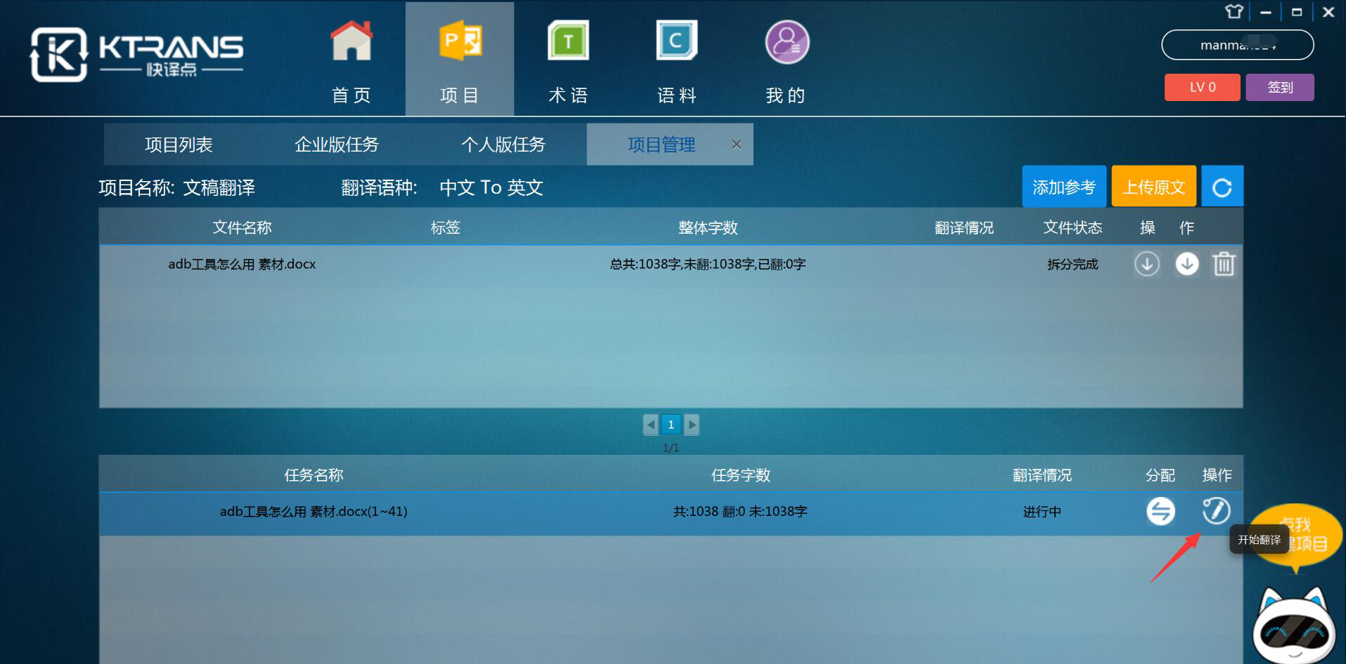 6、当文件上传成功后,它的文件状态会显示“拆分完成”。用户点击“开始翻译”的按钮,就可以正式进入快译点快速翻译的界面了。