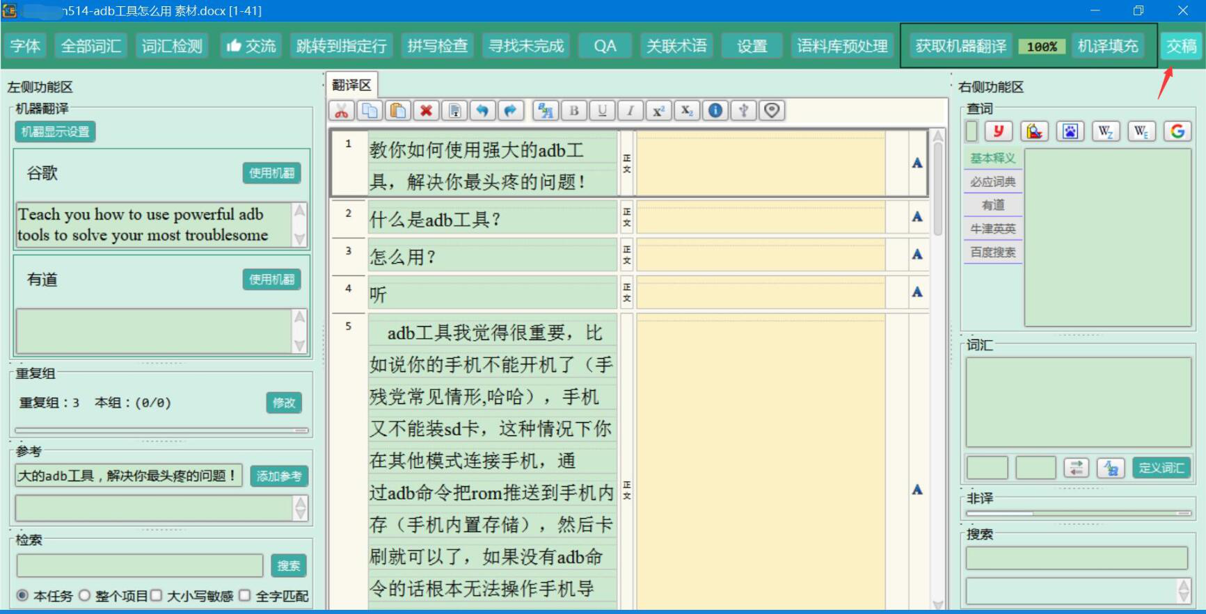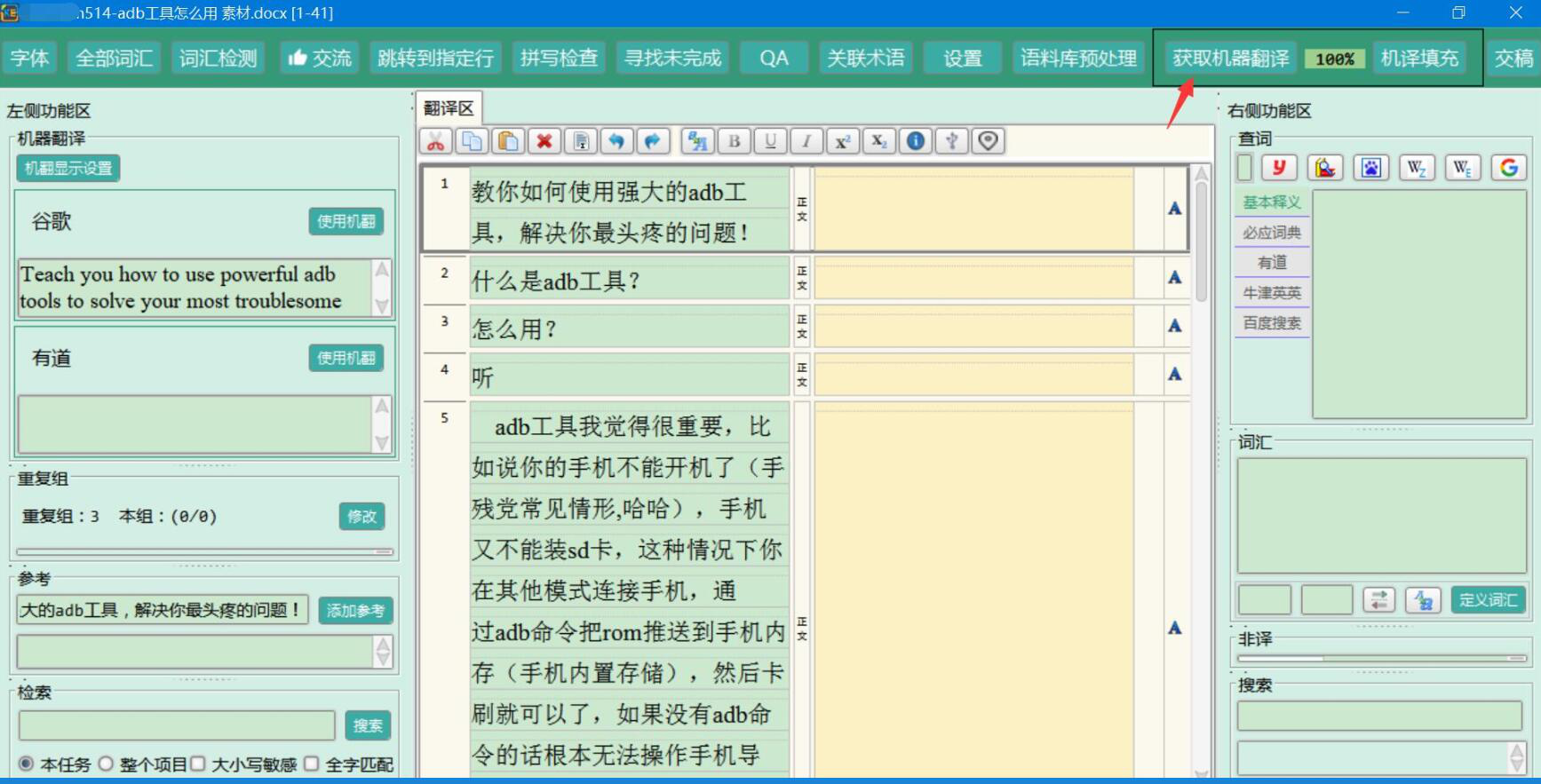 7、接着,快译点就会弹出如下图的快速翻译界面。在此界面中的翻译区,用户可以看到自己上传的文件已经被拆分。当用户点击“获取机器翻译”的时候,在左侧功能区便能一一查看翻译结果了。