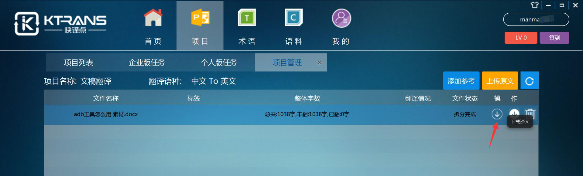9、最后,自动跳转回快译点的项目管理操作界面,用户点击“下载译文”的按钮即可将译文一键下载,如下图所示。