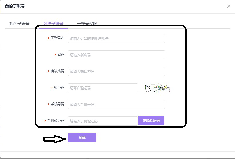 2、点击主菜单中间环形图标,可以看到这里是今天说说账号管理的信息。例如点击【子账号管理】,打开“我的子账号”,在这个界面可以创建子账号和管理子账号权限。