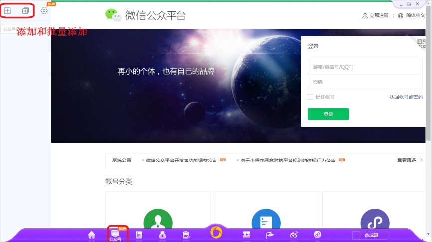3、点击如图图标,打开公众号界面,这里可以添加和批量添加号主的微信公众号并进行登录管理。