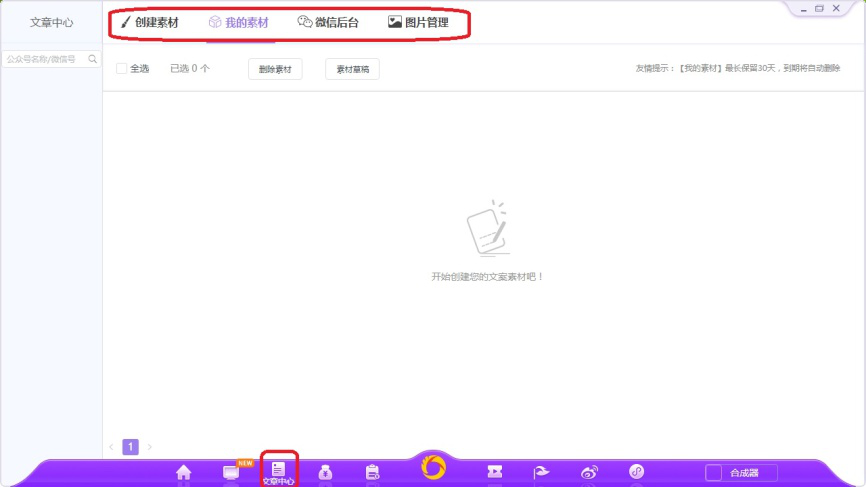4、点击如图图标,打开文章中心界面,在这里用户可以创建素材和对素材进行管理。