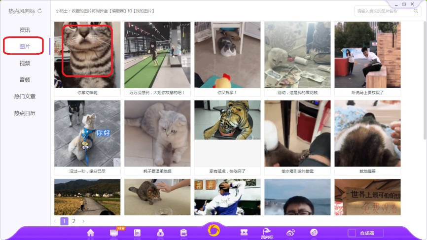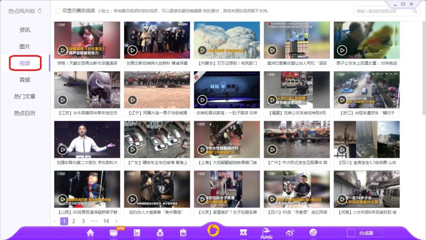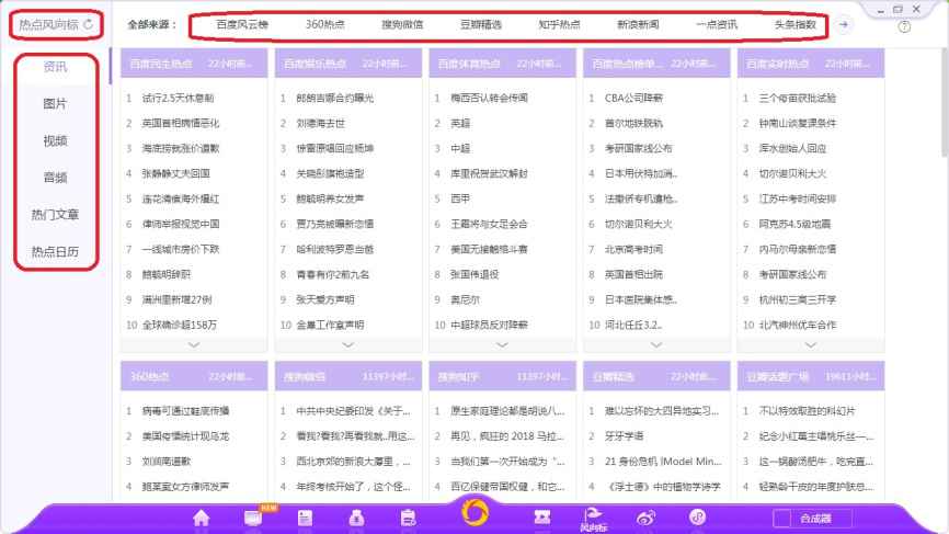 7、点击如图图标,打开热点风向标界面,选择左侧【资讯】选项,这里会实时更新百度风云榜、360热点、搜狗、豆瓣、知乎等网站的热门话题链接。