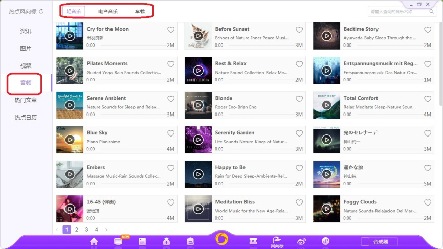 9、依次选择左侧【视频】、【音频】选项,这里会实时更新时下热门的视频和音频素材供用户选择。