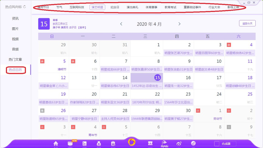 11、依次选择左侧【热点日历】,这里将通用节日、节气、演艺明星、行业大会、影视上映等信息以日历形式展示给用户,方便用户编辑热点资讯。