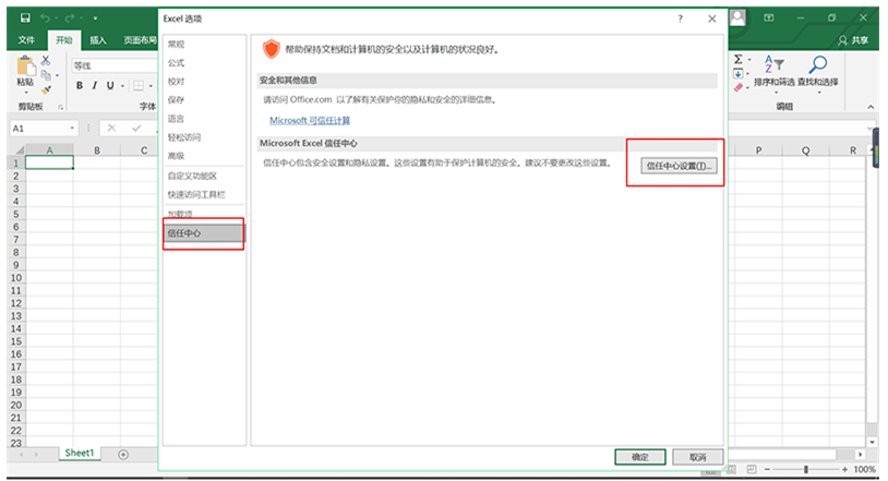 弹出以下界面,在Excel选项面板点击【信任中心】,然后点击【信任中心设置】,