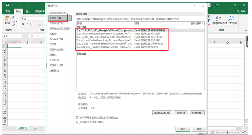 进入信任中心,如图,点击【受信任位置】选项,你可以看到好几个Excel默认启动位置,这就是原因所在,