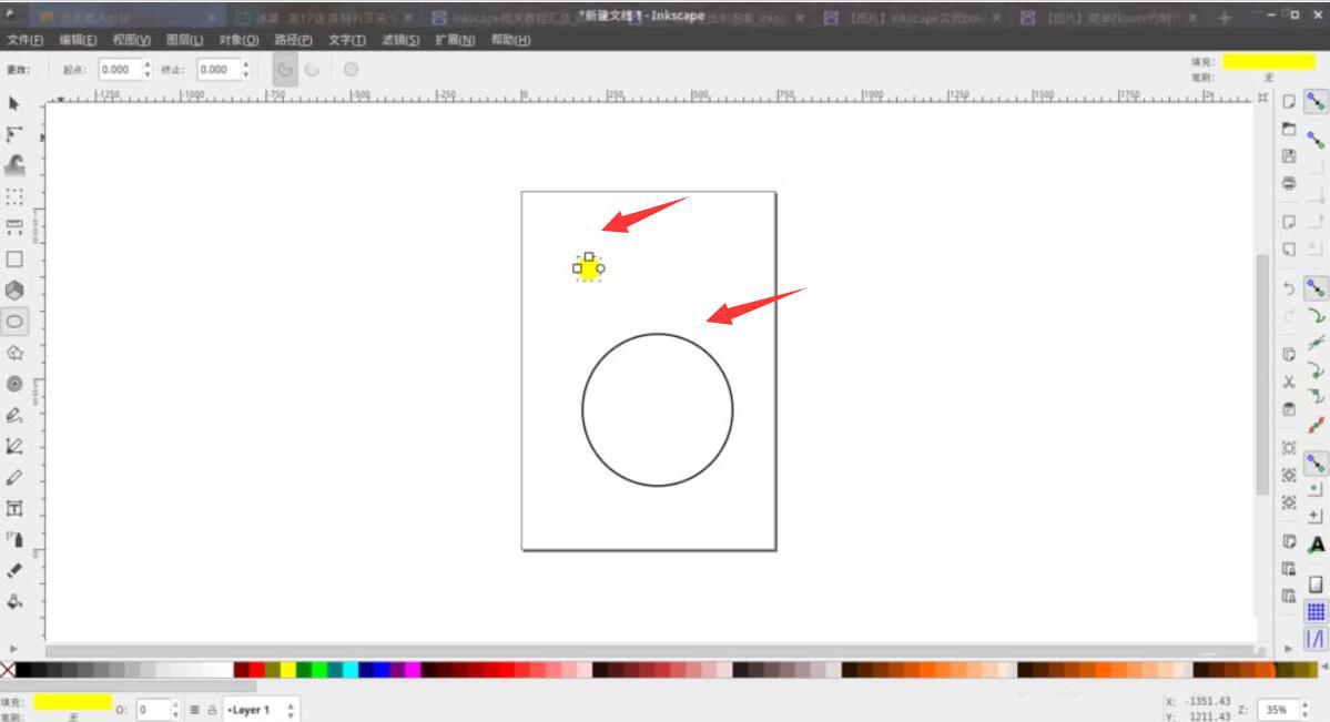 画椭圆的时候,Inkscape还有一个使用小技巧,就是当用户拖动圆最右侧的控制柄,然后在其他空白处放开,就发现又会变多一个圆。