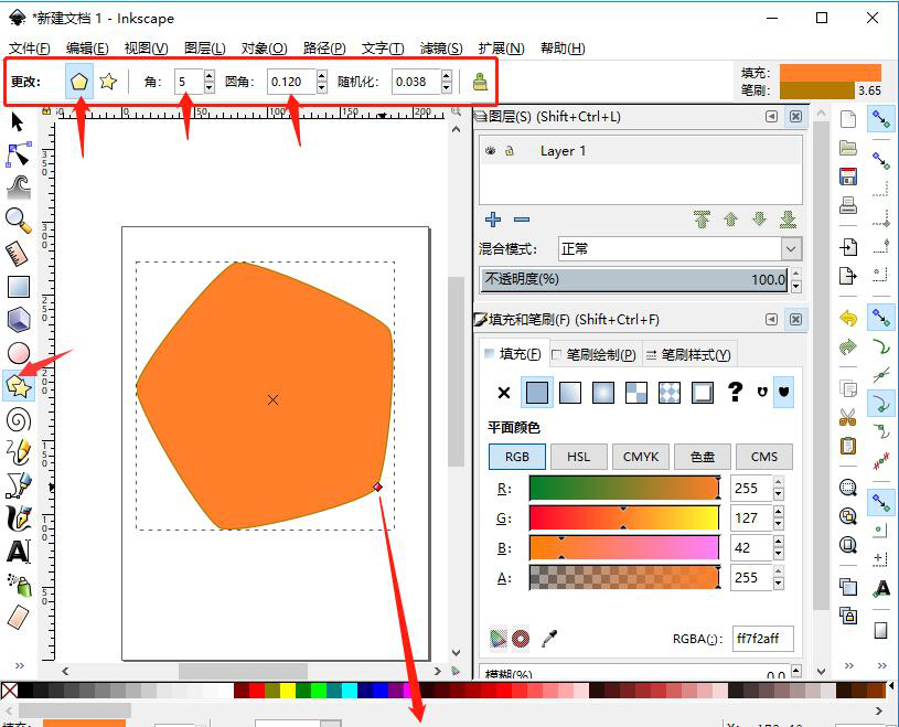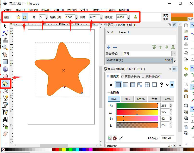 此外,还可以利用Inkscape的星星工具画出多边形,如下图。用户可以设置它角的数量,圆角的大小等等。