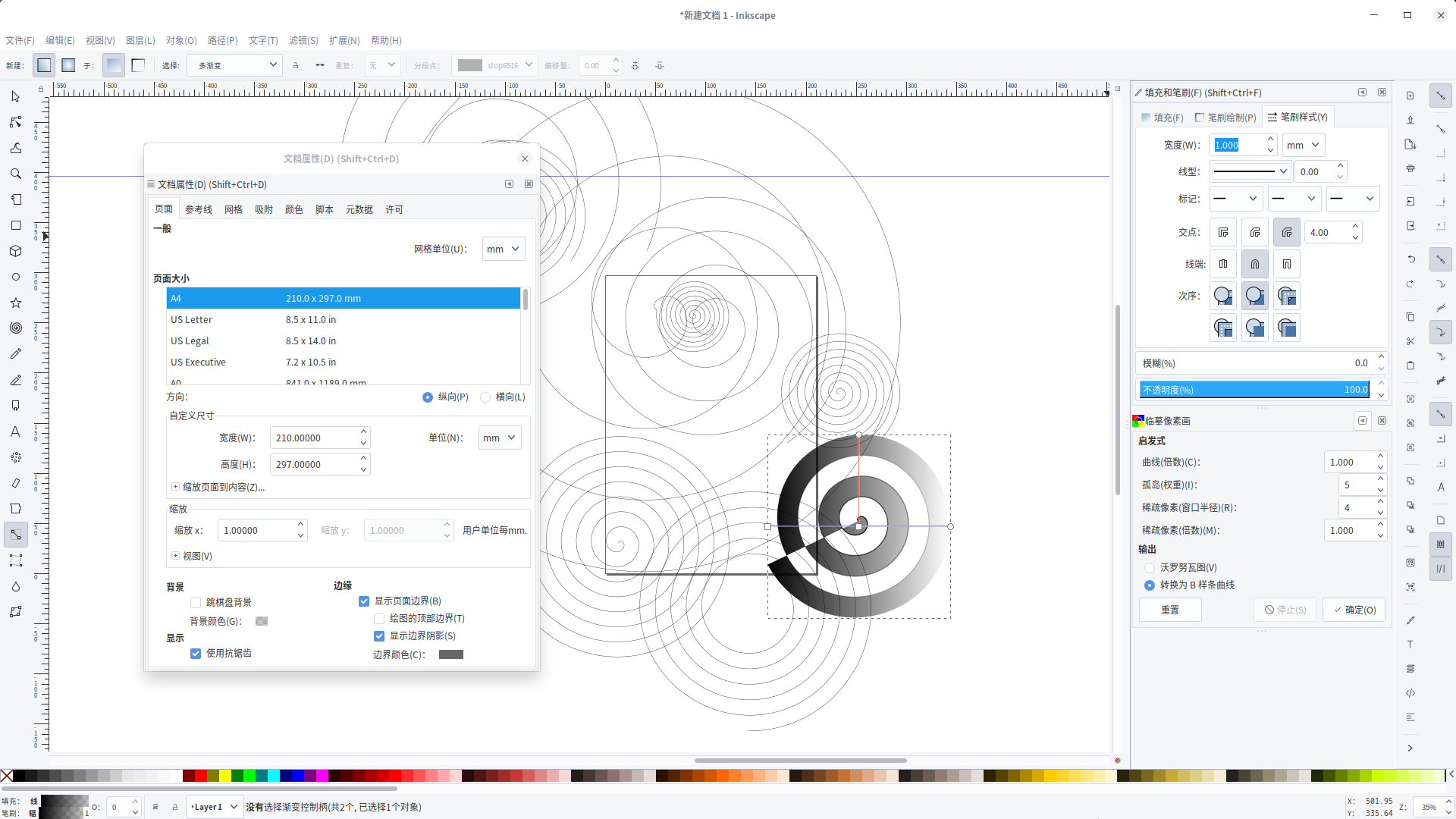 Inkscape还有一个非常人性化的使用小技巧,就是它可以绘制螺旋线。在绘制的时候,要注意下它的技巧,从中心开始绘制。此外,画好之后,可以看到它有两个控制柄,一个在起点处,一个在终点处,可以通过拖动它们来增减螺旋的圈数。