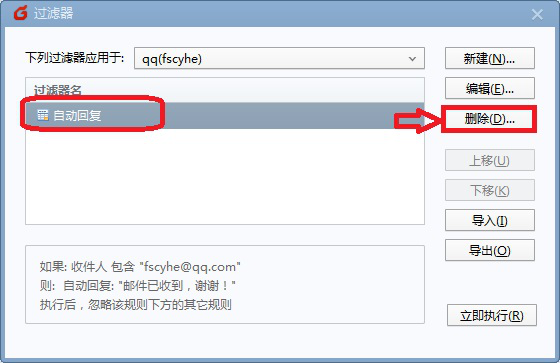 2、弹出“过滤器”窗口,选择要取消邮箱的自动回复,然后点击【删除】。