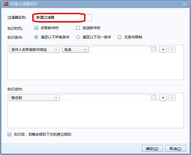 5、弹出“新建过滤器规则”窗口,将过滤器名称“新建过滤器”改为“拒绝邮件”。
