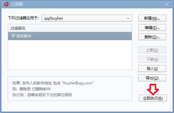 10、在“过滤器”窗口可以看到“拒收邮件”已经被添加,点击【立即执行】;