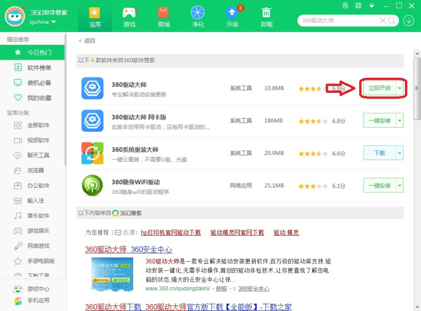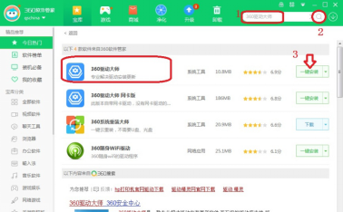 3、在右上搜索栏中输入“360驱动大师”,点击搜索图标。在下方找到“360驱动大师”并点击右边的【一键安装】。