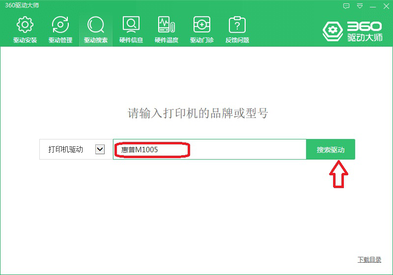 7、在打印机驱动右边方框内输入打印机品牌或型号,然后点击右边【搜索驱动】(如果找不到使用说明书,那么观察打印机外壳,很容易发现品牌或型号名称)。这里以“惠普M1005”为例。