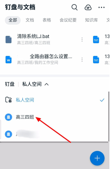 展开下拉菜单,如图,这里有私人空间、企业或组织空间,如果你没有加入企业组织,可以加入或者自行创建;本教程主要解决个人钉盘空间不足的问题,点击【高三四班】,