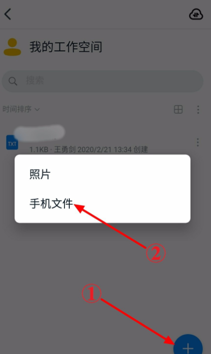 成功释放钉盘内存,点击【+】,弹出选项,点击【手机文件】;