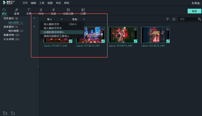 使用数据线将电脑和手机连接,打开喵影工厂,进入界面,点击【素材】——【导入】——【从相机或手机导入】,添加图片和音乐;当然,你也可以先把素材传输到电脑中,然后进行导入。