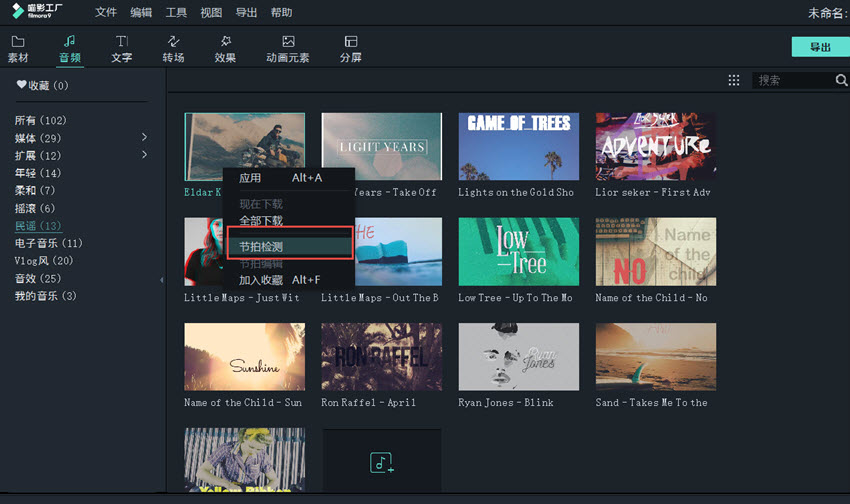 如图,点击【音频】,鼠标右击媒体库中的音乐素材,选择【节拍检测】,喵影工厂将会自动分析、检测音乐节奏,