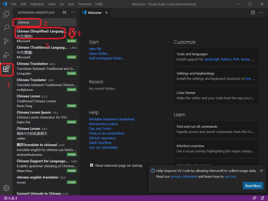 2、如图所示,首先点击扩展选项(图中标识为“1”),接着在搜索栏中输入“chinese”或“language” (图中标识为“2”),然后找到“Chinese(Simplified) language ...(中文简体)”,最后点击后面的【install】(意为“安装”)。