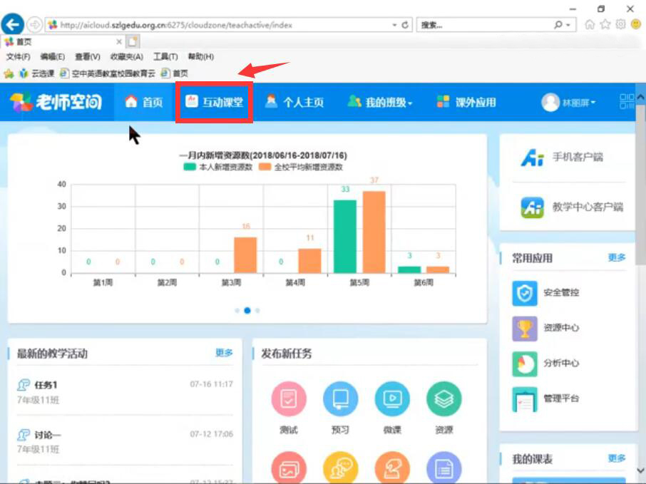 6、如果老师想要将学生的作品下载到电脑本地,那么就进入老师空间,点击“互动课堂”。