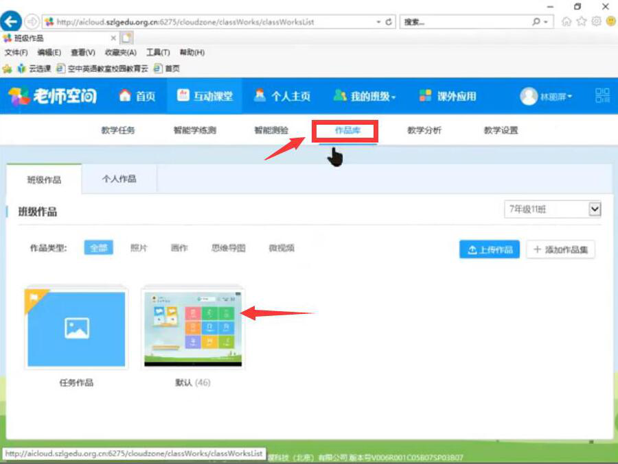 7、在互动课堂的操作界面中,点击“作品库”,在班级作品中点击作品库,如下图所示。