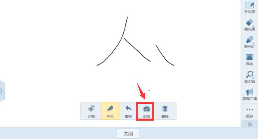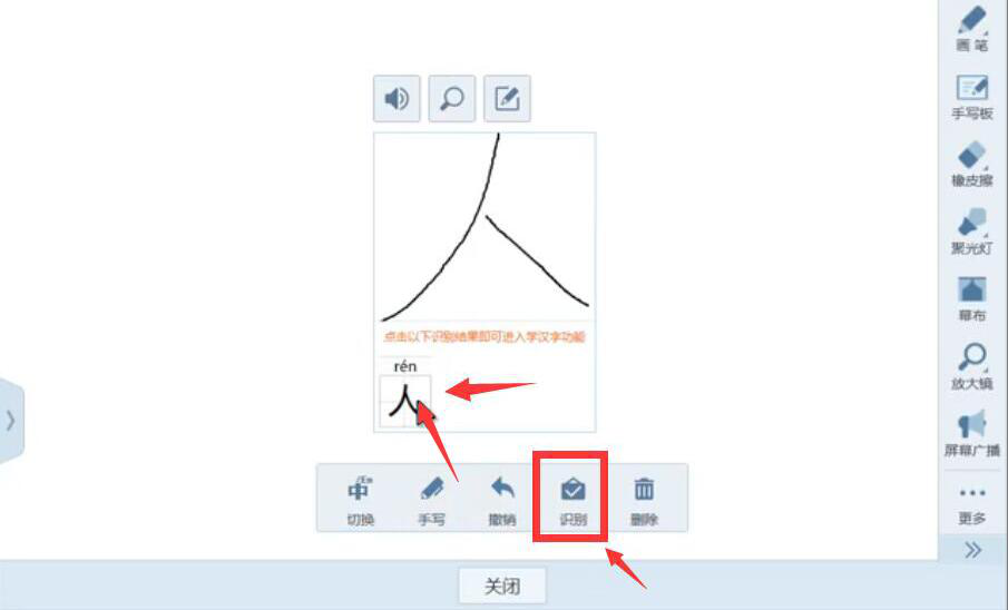 5、点击AiClass手写板中的“识别”按钮,再次对更正后的生字词进行识别。识别后的结果会展示在手写的生字词下面。点击识别的生字词,从而进入文字动画的界面。
