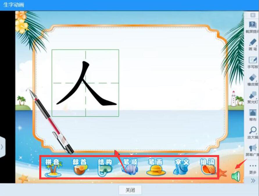 6、在文字动画的操作界面中,可以根据自己的需要点击相应的功能,例如拼音、部首、结构、字义、读音等等。学会后,点击下方的“关闭”按钮即可结束AiClass手写板环节。