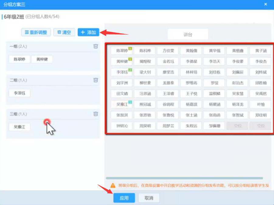 3、在分组方案的操作界面中,老师点击“+添加”按钮即可添加自己想要的分组,并通过拖拽的方式将右侧的学生分别归类到自己所建的分组中。多余的分组可以点击该分组右上侧的删除按钮,即可删除。AiClass分组设置完成后,点击下方的“应用”按钮即可。