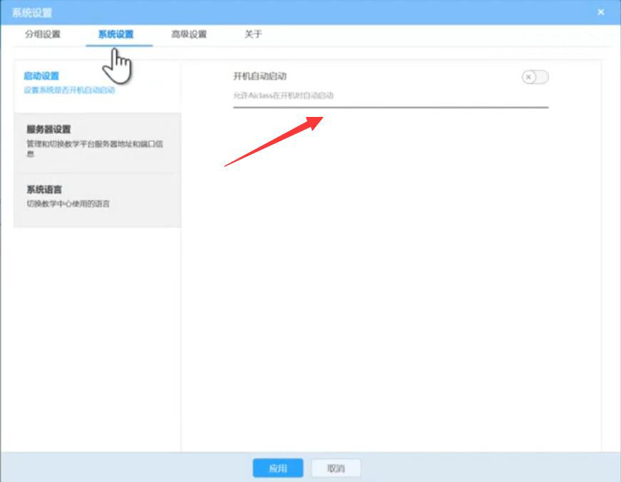 1、在AiClass系统设置界面中,切换到“系统设置”。点击左侧的“启动设置”,在右侧便可选择是否开机时自动启动AiClass。