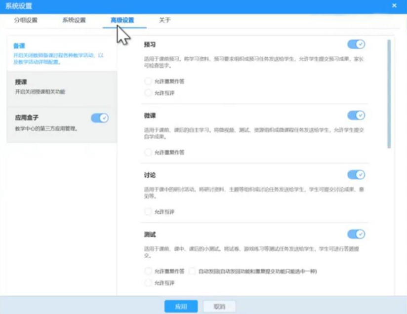 1、AiClass系统设置中,老师还可以切换到“高级设置”的设置界面。比如说“备课”,老师就可以在其对应的右侧,将自己平时不常用的功能模块给关闭。