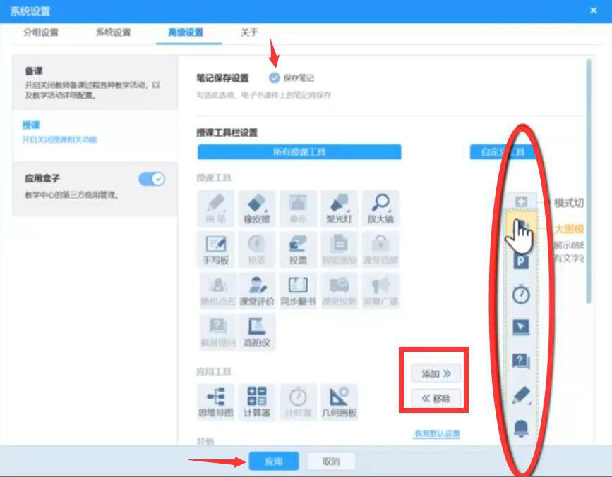 2、经常用AiClass授课的话,可以在授课对应的设置界面中,点选是否保存笔记,对自己常用的工具进行排序,添加或者移除某些工具,最后,点击下方的“应用”按钮即可。