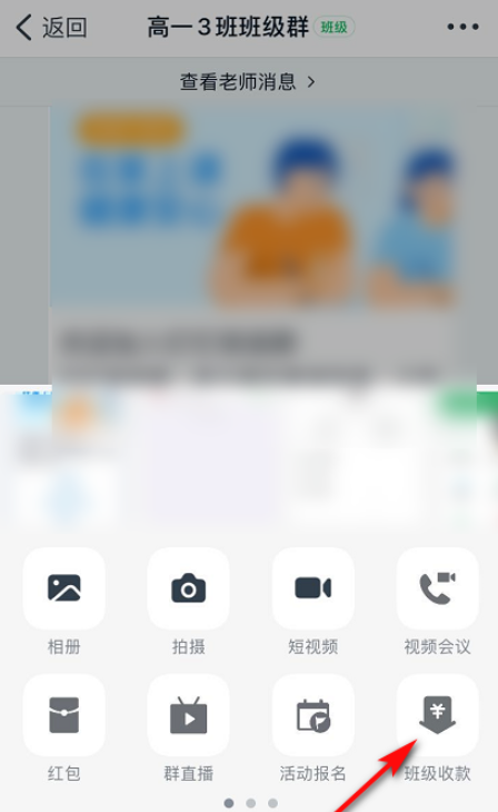 进入群聊窗口,如图,点击下方【+】,弹出选项,点击【班级收款】功能,