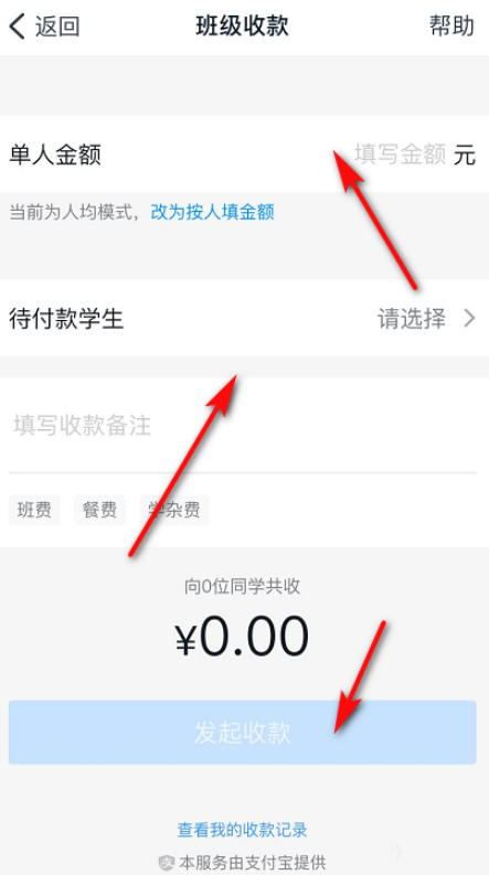 打开班级收款功能,如图,设置金额,选择模式,添加付款方,然后点击【发起收款】即可。