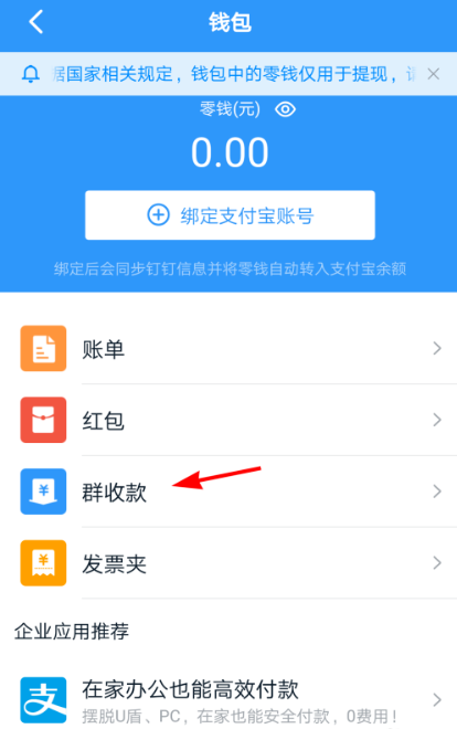 进入钱包界面,如图,提示需要绑定支付宝,绑定之后会将钉钉零钱自动转入支付宝余额,点击【群收款】,