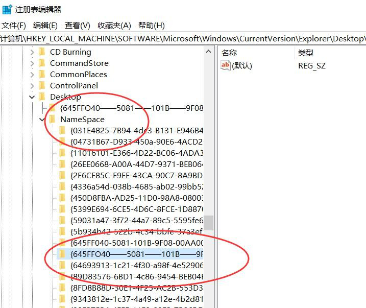 2、打开注册表,依次点击展开【HKEY_LOCAL_MACHINE\\SOFTWARE\\Microsoft\\Windows\\CurrentVersion\\Exp lorer\\Desktop\\NameSpace】,选中对应的NameSpace选项,右击选择新建” 项“ 文件, 将项值命名为” {645FFO40 — — 5081 — — 101B — — 9F08 — — 00AA002F954E}“。