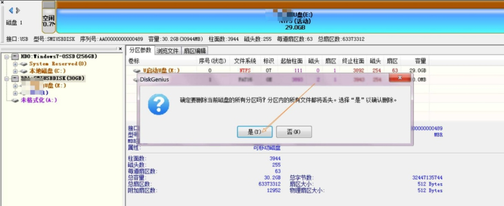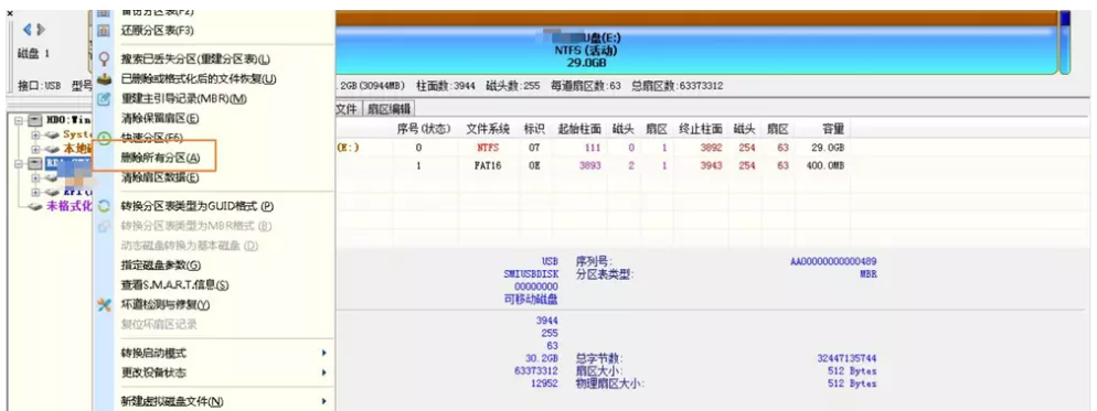 鼠标右击U盘,弹出菜单,选择【删除所有分区】,出现提示,点击确定,
