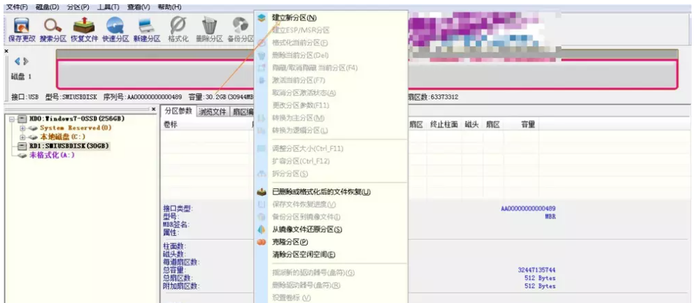 然后点击上方【空闲】区域,鼠标右键,选择【建立新分区】,